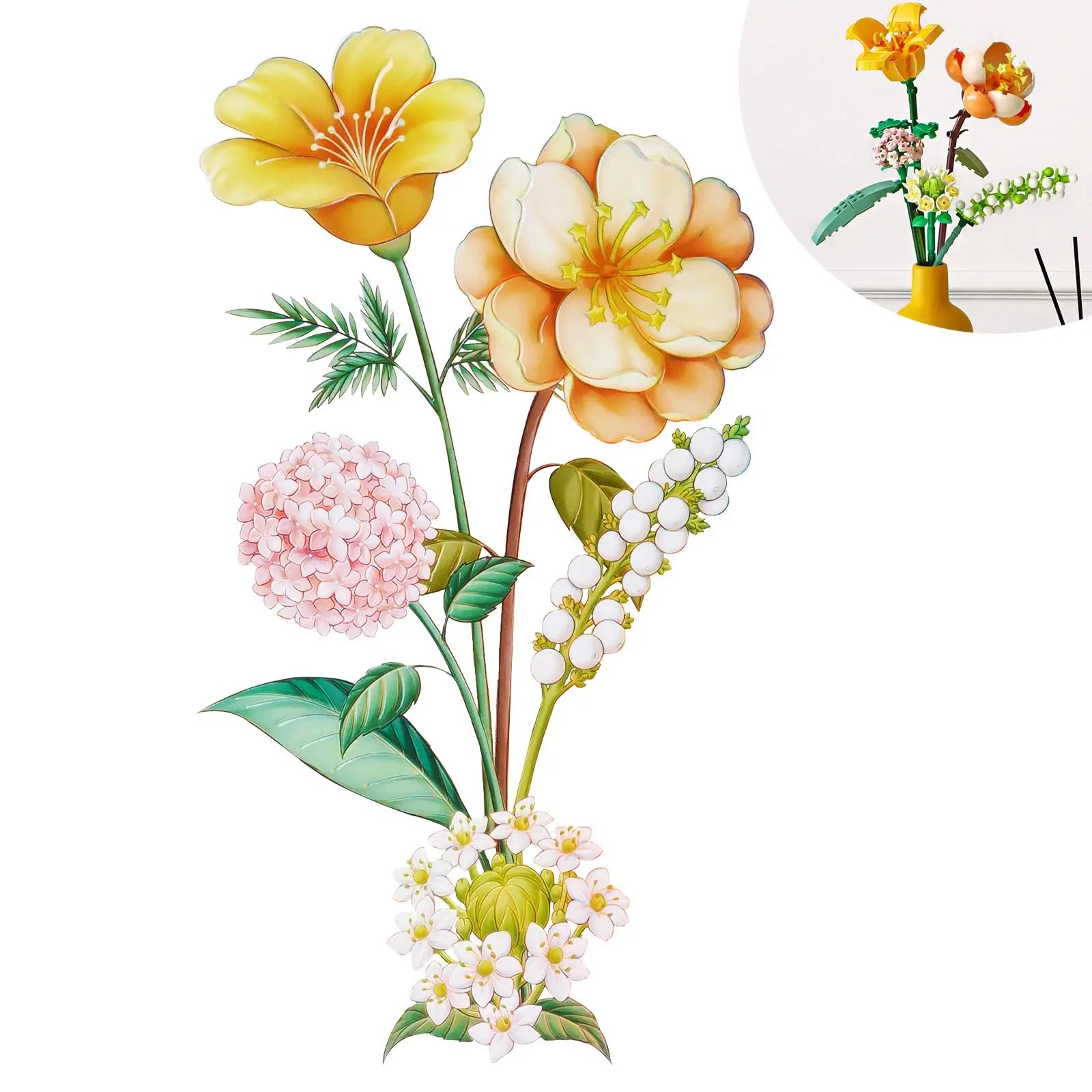 The bouquet set contains purple camellia, lavender, pink rose, hydrangea, etc., each of which has unique characteristics and meanings. The flower stems, petals and leaves can be adjusted to change the shape and create a beautiful arrangement.