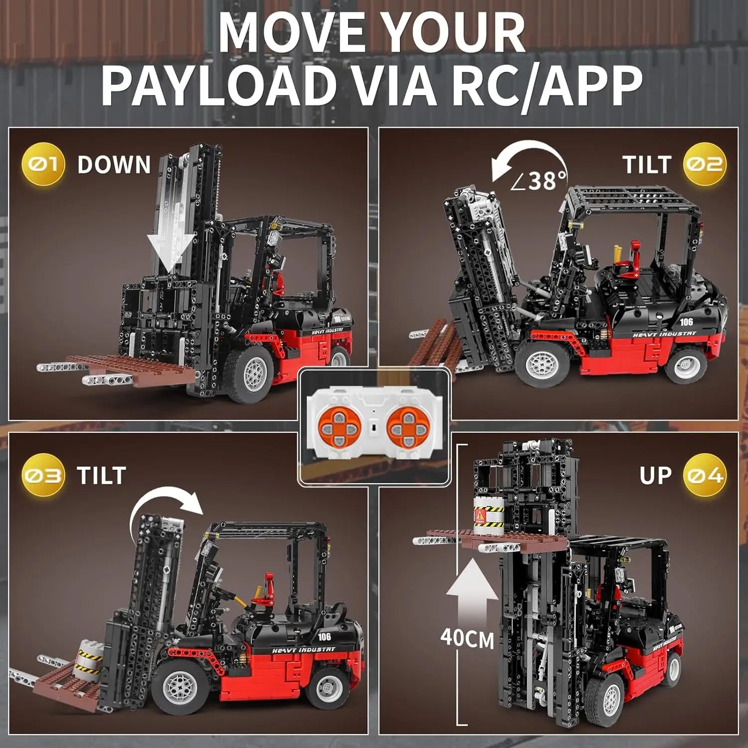 The forklift can lift things really high. Use the remote to lift up to 39.5cm and go back down, just like a real forklift.