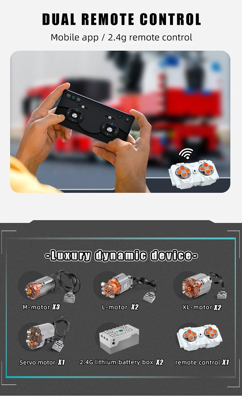 - This fire truck building kit comes with associated power accessories including: Medium Motor, Large Motor, Extra Large Motor, Servo Motor, Remote Control and Lithium Battery.